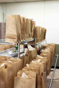 Packed lunch and breakfast meals wait to be distributed to students Tuesday at Blennerhassett Middle School. Schools throughout the county will continue to serve meals for students during the shutdown. (Photo by Michael Erb)