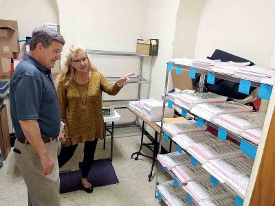 - West Virginia Secretary of State Mac Warner, left, listens as Wood County Deputy Clerk Diana Garrett explains how absentee ballots are organized at the clerk’s office in the Wood County Courthouse Friday. Warner visited multiple county clerks’ offices Friday to check in on how they’re preparing for a larger-than-usual number of absentee ballots as the rescheduled Election Day of June 9 approaches. More people than usual are requesting the ballots because of the COVID-19 pandemic. The Wood County Clerk’s office mailed 3,800 ballots out Friday, the first day they could be sent. (Photo by Evan Bevins)