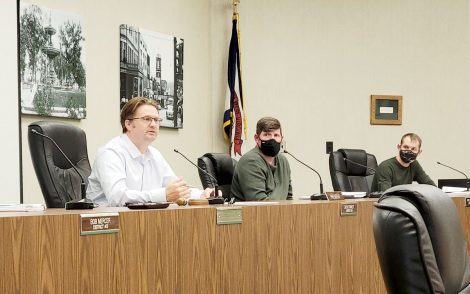 Parkersburg City Council President Zach Stanley, left, speaks during Tuesday’s council meeting at the Municipal Building as Councilmen Chris Rexroad and Austin Richards listen. (Photo by Evan Bevins)