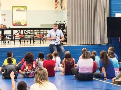 - Parkersburg South graduate and Junior World Championships gold medalist wrestler Braxton Amos speaks to students at Lubeck Elementary School on Tuesday. (Photo by Evan Bevins)