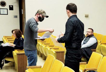 - Parkersburg City Councilman Austin Richards, left, hands papers on the city’s American Rescue Plan funds to Reed Byers, an employee of Give More Connections, during a special meeting Tuesday. (Photo by Evan Bevins)