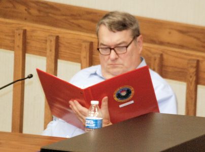 Parkersburg City Attorney Blaine Myers looks over the proposed municipal budget during a hearing Monday in City Council chambers. (Photo by Evan Bevins)