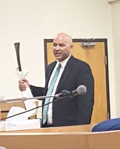Defense attorney Joe Munoz picks up a pry bar, used as evidence in the trial of William Nutter, who shot and killed his brother Charles Ryan Cottle in May 2020. The trial concluded Friday. (Photo by Candice Black)