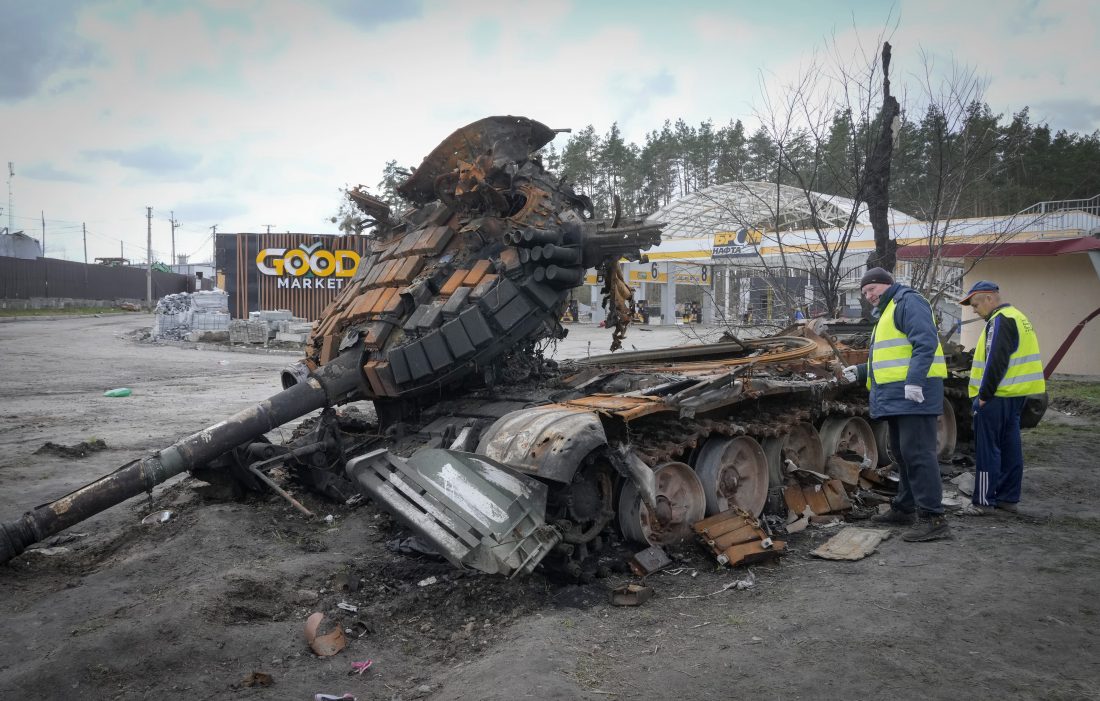 Road workers examine a destroyed Russian tank on the highway to Kyiv, Ukraine, Monday, April 11, 2022. (AP Photo/Efrem Lukatsky)