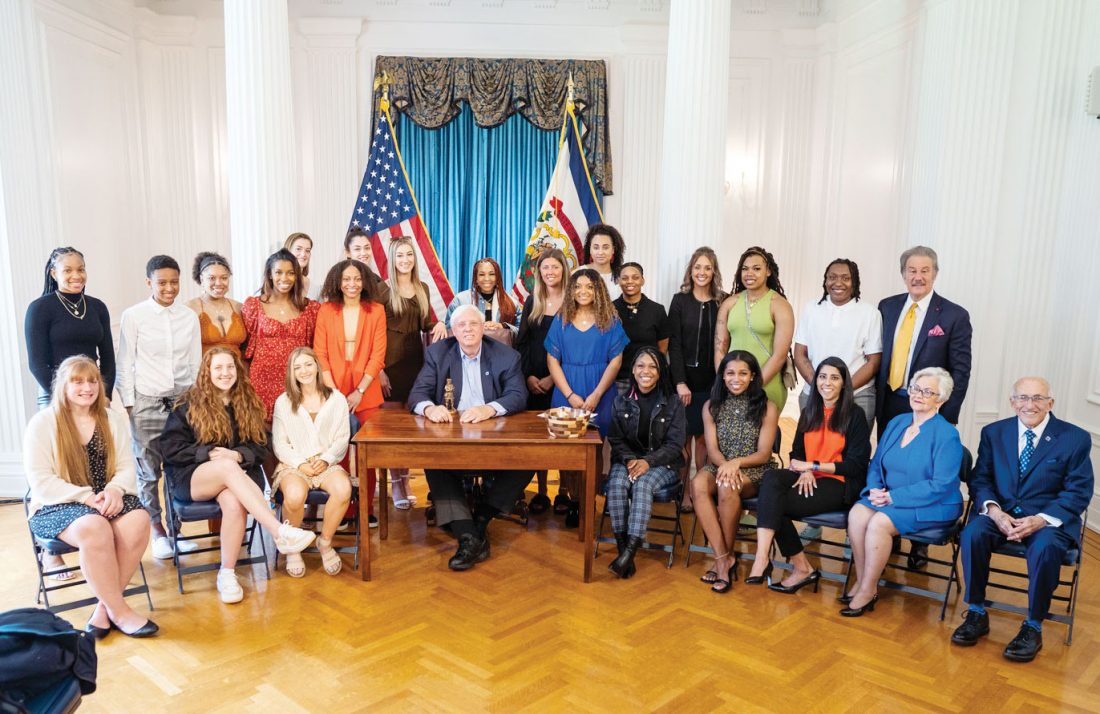 Gov. Jim Justice met with players, coaches and supporters of the NCAA Division II national champion Glenville State University women’s basketball team prior to Thursday’s online COVID-19 briefing. (Photo Provided)