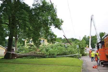 - Crews from MonPower and Asplundh worked to remove a tree that had fallen on 27th Street in Vienna Tuesday afternoon after heavy storms moved through the area in the early morning hours which resulted in power outages for many Vienna residents. (Photo by Douglass Huxley)
