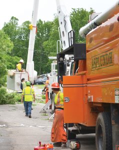 Crews from MonPower and Asplundh worked to remove a tree that had fallen on 27th Street in Vienna Tuesday afternoon after heavy storms moved through the area in the early morning hours which resulted in power outages for many Vienna residents. (Photo by Douglass Huxley)