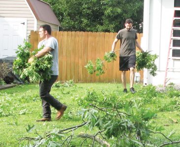 Rylan Hamilton and Tyler Moore removed tree limbs from a home on 41st Street in Vienna on Tuesday. A Monday evening storm downed trees and lines in the region, causing numerous power disruptions. The street was barricaded until the limb, which brought down a utility line in the road, was removed. (Photo by Jess Mancini)