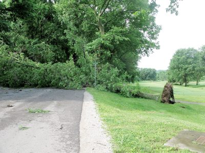 - A large red oak tree came down in Belpre’s Howes Grove Park as a result of the storms that hit the area Monday night and Tuesday morning. Officials said it was the oldest tree in the park. City crews will begin the work of removing it. (Photo by Brett Dunlap)