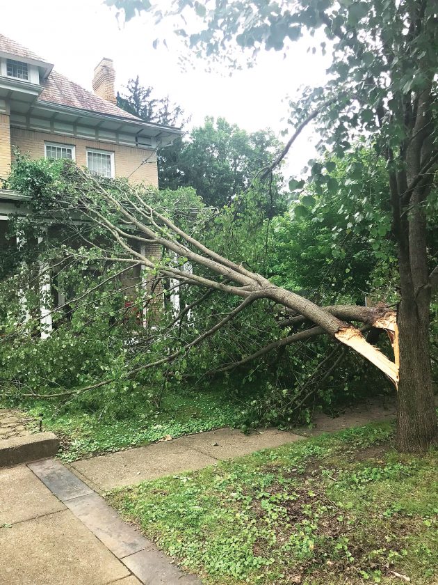 A tree on Laird Avenue fell on a house after Wednesday night's storm. (Photo by Kristofer McKenna)