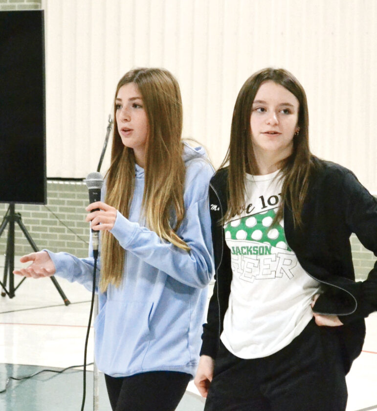 - Jackson Middle School students Camille Patterson and Malia Williams answered questions from Greenmont Elementary students Thursday. Patterson and Williams visited the school as part of Red Ribbon Week. (Photo by Douglass Huxley)