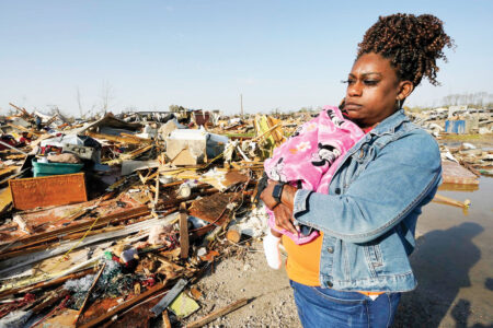 - Wonder Bolden cradles her 1-year-old granddaughter Journey Bolden as she surveys the remains of her mother’s tornado demolished mobile home in Rolling Fork, Miss., Saturday. (AP Photo)