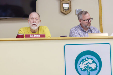 - Councilmember Pat Peters, left, discusses the tree ordinance during Tuesday’s Williamstown City Council meeting. Also pictured is Shane King, councilmember, right. (Photo by James Dobbs)