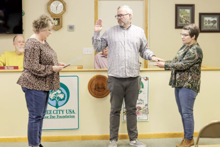 - Williamstown City Clerk Stephanie Stengel, left, swears in Shane King, middle, chairman of the board of zoning appeals, to council at Tuesday’s Williamstown City Council meeting. Also pictured is King’s wife, Tricia King, right. (Photo by James Dobbs)