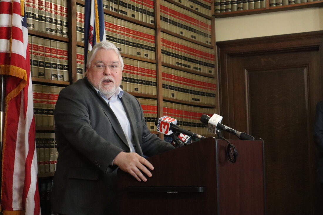 West Virginia Attorney General Patrick Morrisey speaks during a press conference at the state Capitol in Charleston in February 2022. (AP Photo)