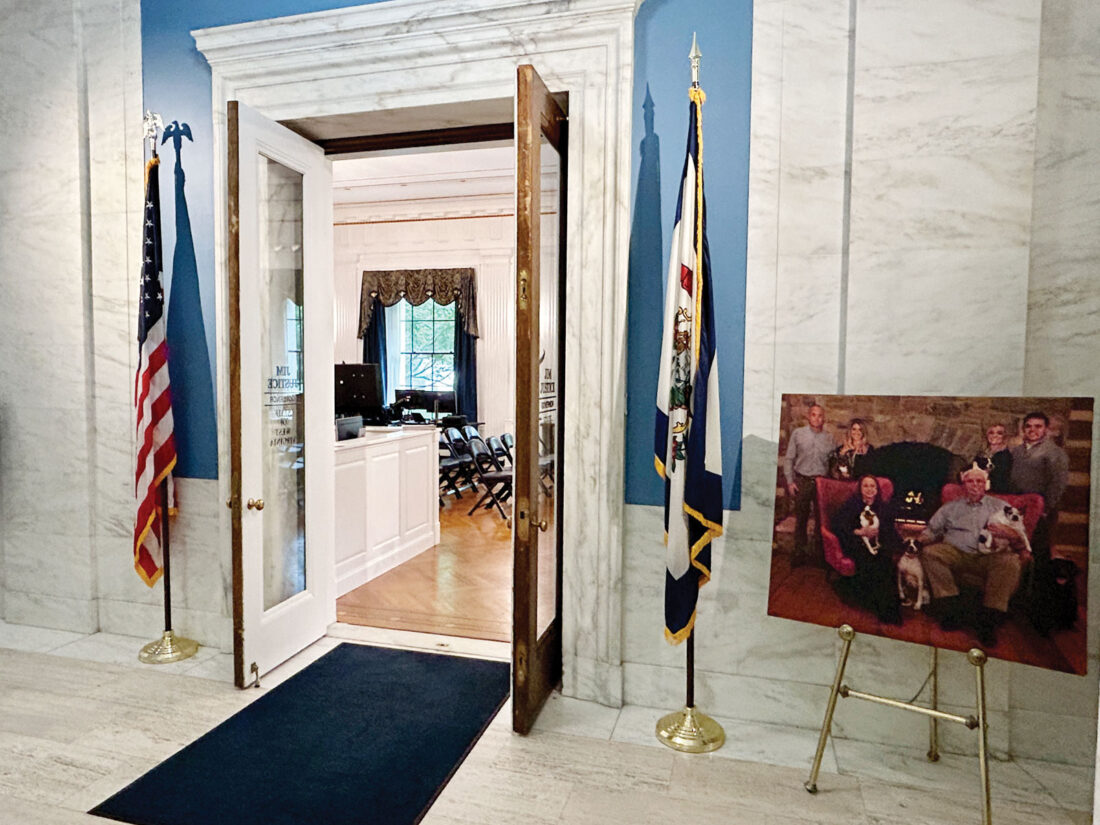 A photo of Gov. Jim Justice, his wife Cathy Justice and the Justice family sits outside the entrance to the governor’s office in the West Wing of the Capitol in Charleston. (Photo by Steven Allen Adams)