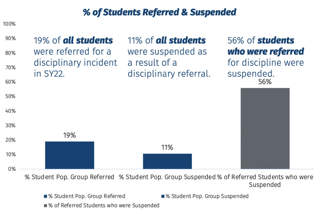 Looking at the data, 19% of all students during the 2022 school year were referred for a disciplinary incident, with 11% of all students suspended as a result. Of the number of students referred for discipline, 56% were suspended.