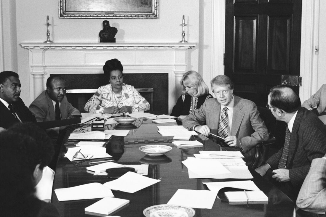 - FILE – President Jimmy Carter meets with his commission for the appointment of blacks to the federal judiciary in the fifth circuit at the White House in Washington Wednesday, June 29, 1977. From left are: Horace Tate, Georgia state senator; Joe Reid; Coretta King, widow of Martin Luther King Jr.; Margaret McKenna, a staff aide; Carter; and Attorney General Griffin Bell. (AP Photo/Harvey Georges, File)