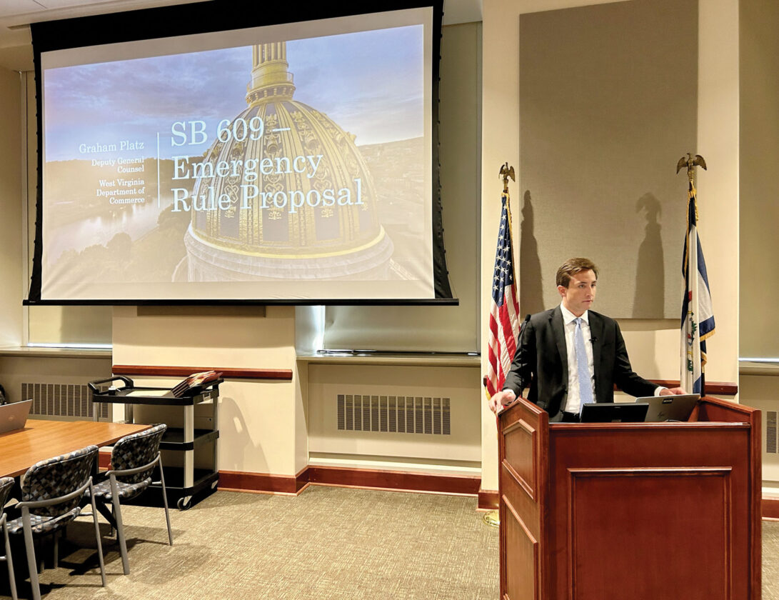 Graham Platz, deputy general counsel for the West Virginia Department of Commerce, explains the proposed emergency rule requiring approval by the state Public Energy Authority to allow power plants using fossil fuels to be decommissioned or deconstructed. (Photo by Steven Allen Adams)