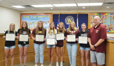 The Williamstown High School Girls Track Team was recognized by the Wood County Schools Board of Education Tuesday night for winning their fourth straight Class A State Championship. Pictured from left: Sydney Anderson, Isabella Bryant, Reagan Corbett, Kate Florence, Kyndra Johnson, Ava Lightfritz and head coach Zach Taylor. (Photo by Douglass Huxley)