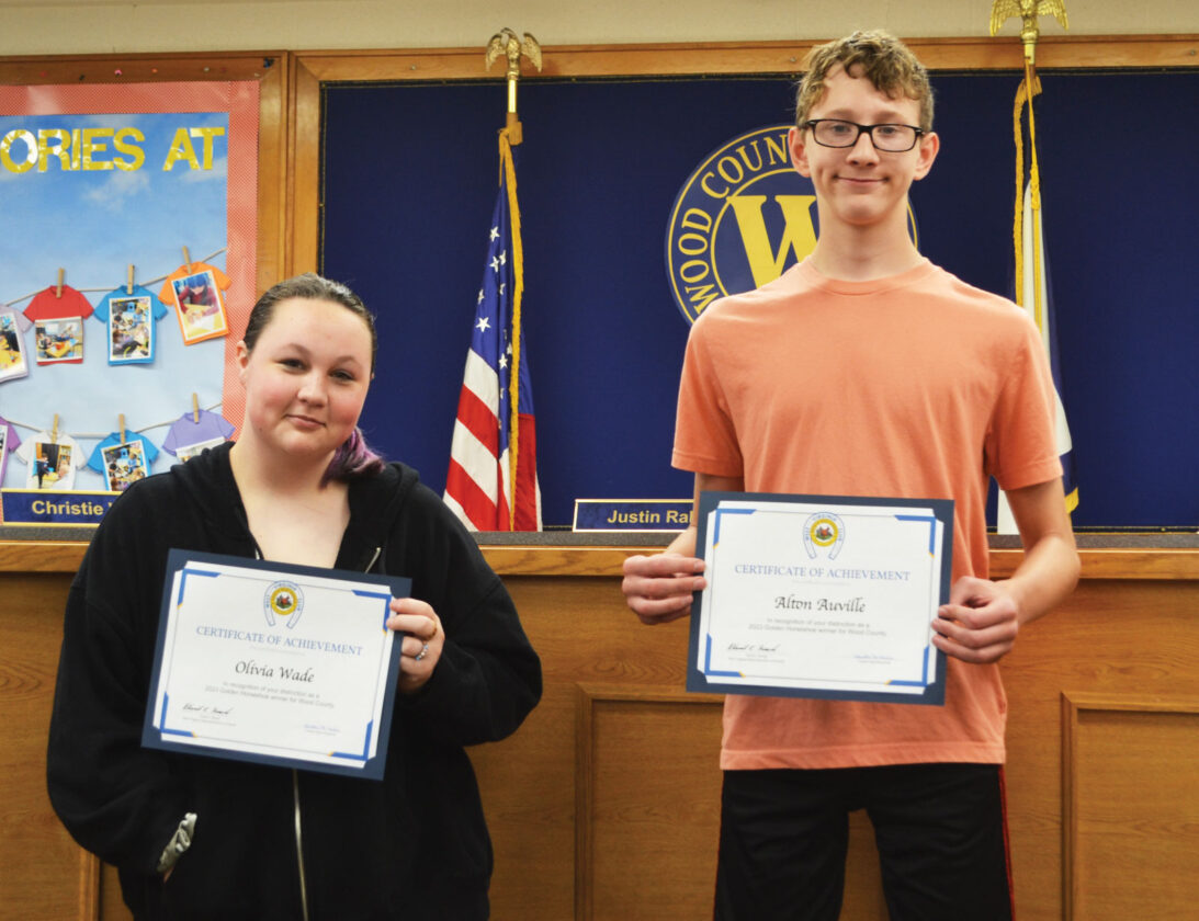 - The Wood County Schools Board of Education recognized the recent Golden Horseshoe Winners from Wood County during Tuesday’s meeting. Pictured are Olivia Wade and Alton Auville from Blennerhassett Middle School. (Photo by Douglass Huxley)
