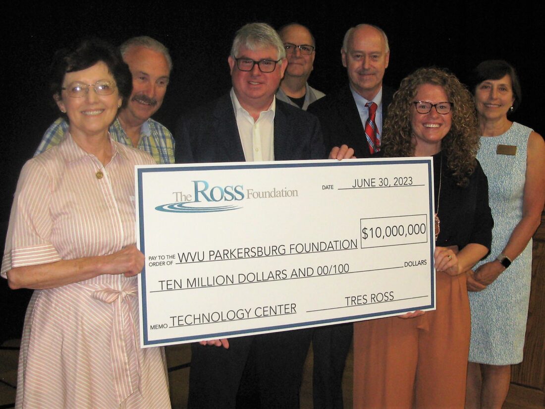 West Virginia University at Parkersburg this morning announced a $10 million gift from the Ross Foundation, the largest gift in the history of the school and possibly in the history of the Community and Technical College System in West Virginia. The funds will be used to purchase the former Ohio Valley University and establish the West Virginia University Parkersburg Technology Center. Posing with the ceremonial check are, from left, Becky Deem-McGinnis of the WVU Parkersburg Foundation, Delegate Vernon Criss, Tres Ross of the Ross Foundation, Joe Oliverio of the Board of Governors, Steve Hardman of the Board of Governors, WVU Parkersburg President Tori Jackson and Donna Smith of the Board of Governors.