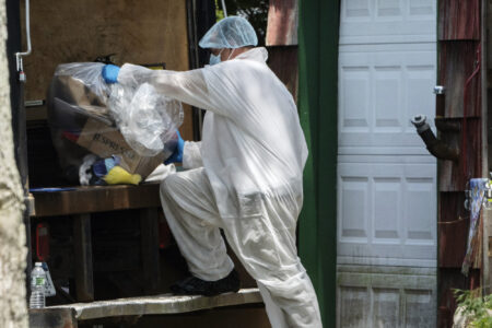 A crime laboratory officer places a bag of items into the back of a truck as law enforcement searches the home of Rex Heuermann, Saturday, July 15, 2023, in Massapequa Park, N.Y. Heuermann, a Long Island architect, was charged Friday, July 14, with murder in the deaths of three of the 11 victims in a long-unsolved string of killings known as the Gilgo Beach murders. (AP Photo)