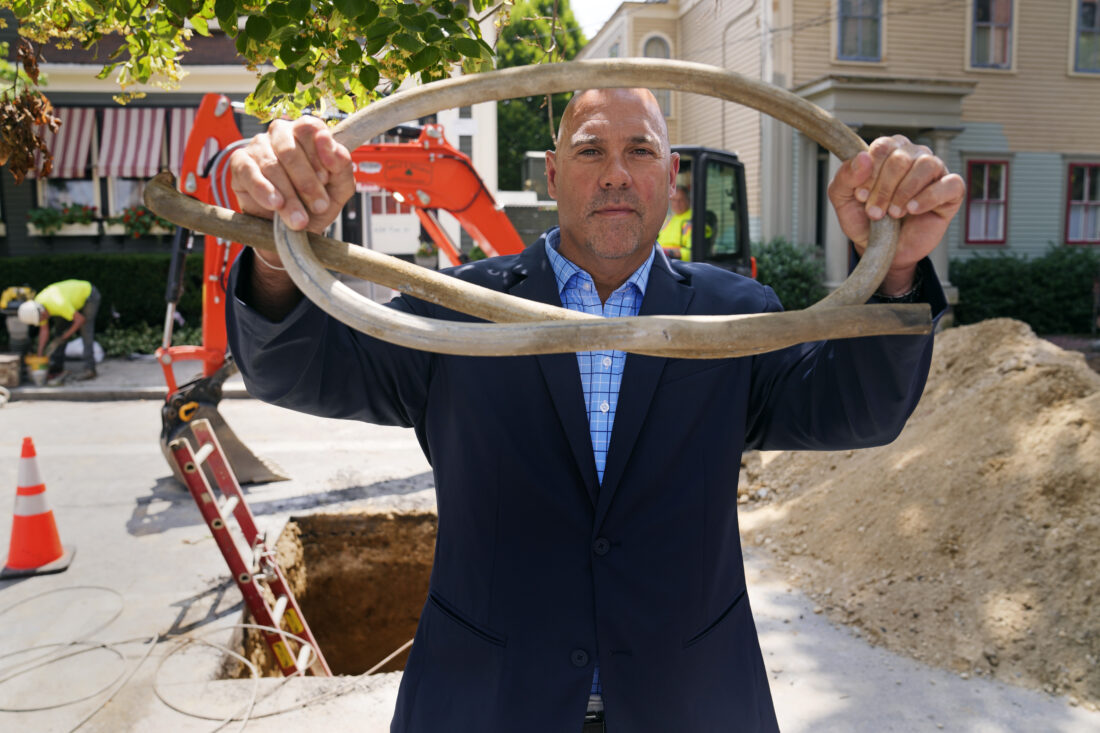 - Providence Water general manager Ricky Caruolo, shows a length of lead residential water supply line, which was removed and replaced with copper, outside a home, Thursday, June 29, 2023, in Providence, R.I. He said officials have addressed lead head-on, improving water treatment, educating the public about lead and providing no-interest loans for pipe removal. (AP Photo)