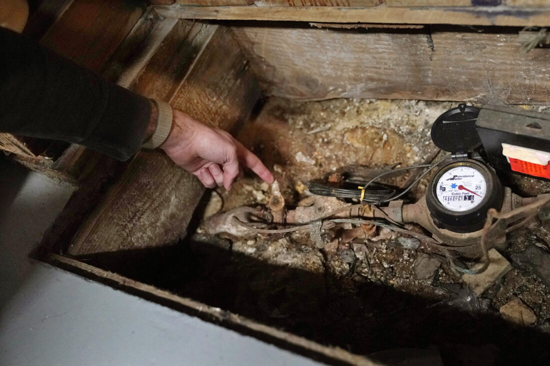- Home owner Jonathan Crossman points out the existing lead residential water supply line before the Providence Water meter in the basement of his family’s home, Thursday, March 23, 2023, in Providence, R.I. Health and environmental groups have been fighting for lead-free water to drink in Providence for at least a decade. (AP Photo)