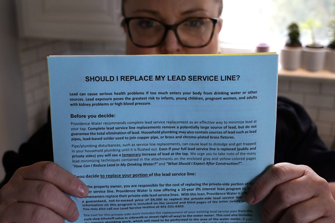 - Colleen Colarusso, shows a letter she received from Providence Water citing health concerns with her residential water delivered through lead pipes, in the kitchen of her home, Thursday, March 23, 2023, in Providence, R.I. Testing showed lead levels in her water at more than twice the federal limit. Before that, she drank and cooked with tap water. (AP Photo)