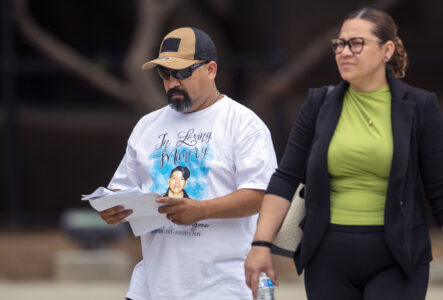 Francisco Rodriguez, left, wearing a T-shirt with an image of his son Javier Rodriguez, who was killed in the Walmart mass shooting leaves the federal court in El Paso, Texas, Thursday, July 6, 2023. Nearly four years after a white gunman killed 23 people at a Walmart in El Paso in a racist attack that targeted Hispanic shoppers, relatives of the victims are packing a courtroom near the U.S.-Mexico border this week to see Patrick Crusius punished for one of the nation's worst mass shootings. (AP Photo)