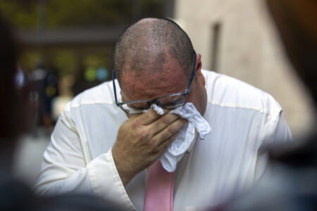Paul Jamrowski, father of Jordan Anchondo and father in-law of Andre Anchondo, who both died in the El Paso Walmart mass shooting, breaks down in tears while speaking to the media outside the federal court in El Paso, Texas, Wednesday, July 5, 2023. Patrick Crusius, who is accused of killing nearly two dozen people in a racist attack at an El Paso Walmart in August 2019, is set to receive multiple life sentences after pleading guilty to federal hate crimes and weapons charges in one of the deadliest mass shootings in U.S. history. (AP Photo)