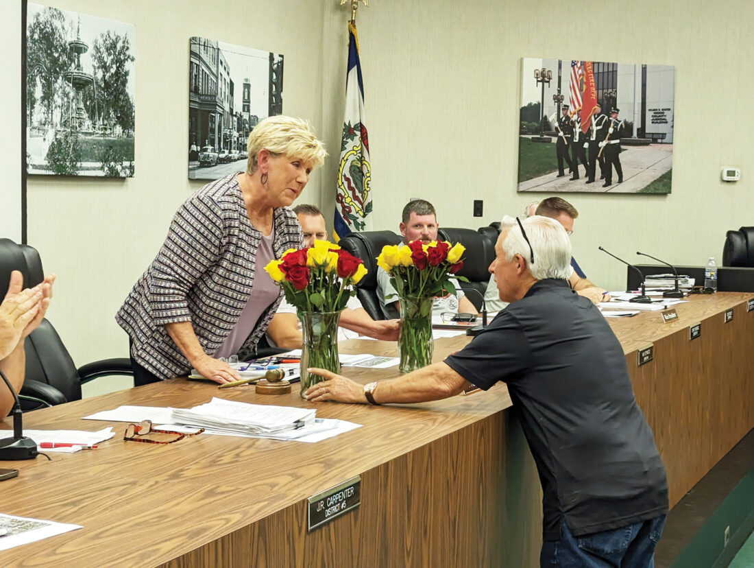 Parkersburg City Council President Sharon Kuhl, left, thanks Bible Baptist Church Pastor Dan Stevens after he and Police Chief Matthew Board presented her and fellow National Night Out organizer Debbie Jeffrey with roses as thanks for their work coordinating the Aug. 1 event during Tuesday’s council meeting. National Night Out encourages interaction between police and the community, particularly children. (Photo by Evan Bevins)