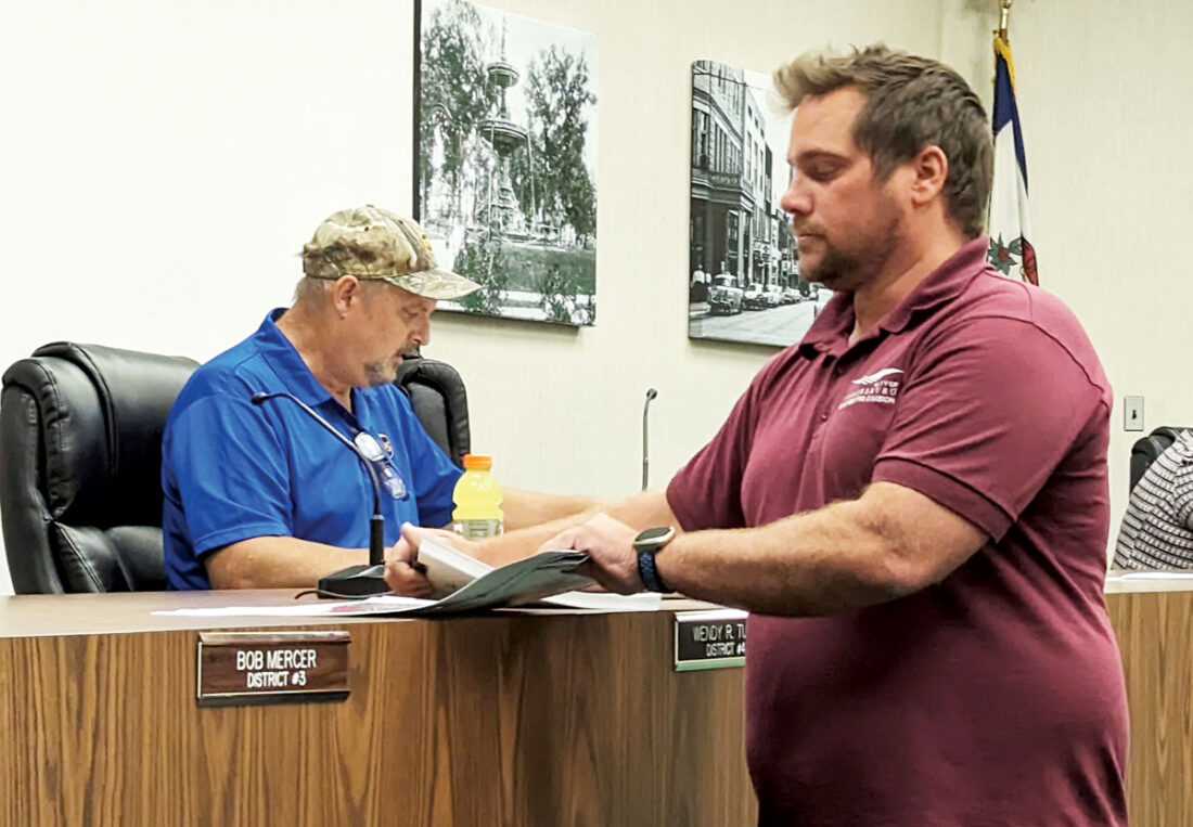 - Parkersburg City Engineer Adam Stout distributes maps of the floodplain near the Economy Inn on Seventh Street prior to Tuesday’s Parkersburg City Council meeting. Council, acting as the Urban Renewal Authority, voted 5-2 to purchase the site for $681,000 late Tuesday evening. (Photo by Evan Bevins)