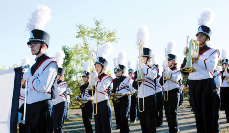 The Parkersburg South High School Marching Band stands at attention Tuesday at the start of the annual Homecoming Parade. Numerous floats encouraging team spirit were in the procession from Fairplains School to Erickson Field. (Photo by Jess Mancini)