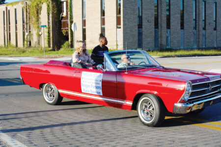 From left, Reagan Parsons and Mario Dawson cruise in a Ford Fairlane with a 390 cubic inch motor in Tuesday’s Parkersburg South High School Homecoming Parade. (Photo by Jess Mancini)