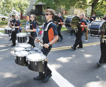 The percussion section of Marietta High School’s Wall of Sound performs “Eye of the Tiger” Saturday during the Washington County Fair parade on Front Street in Marietta. (Photo by Evan Bevins)