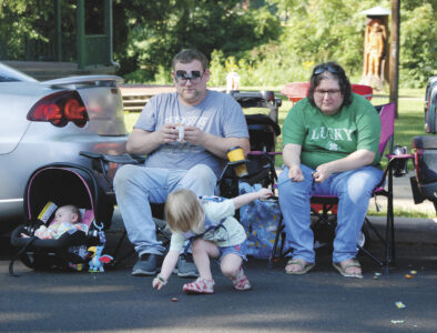 - Alexandra Johnson, 2, of Fleming, reaches for some candy during the Washington County Fair parade on Front Street in Marietta Saturday. Also pictured are, from left, her sister Scarlett, father William and mother Sarah Johnson. (Photo by Evan Bevins)