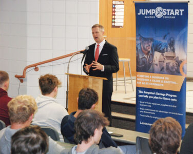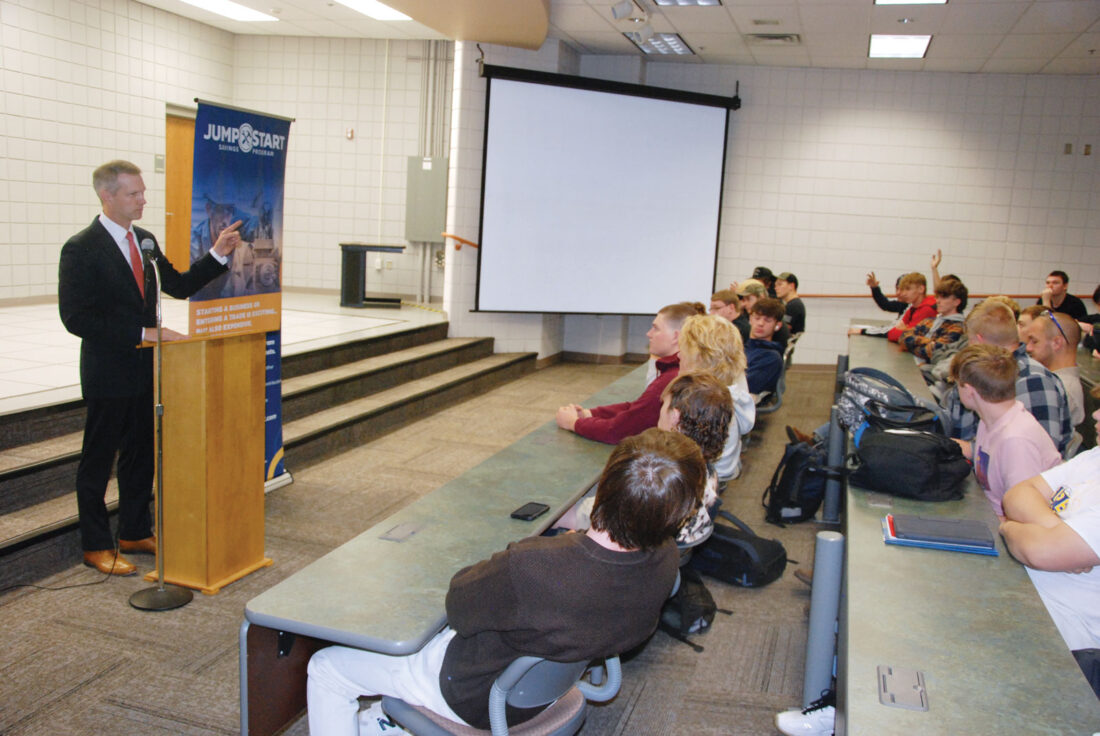 West Virginia Treasurer Riley Moore discusses the state’s Jumpstart Savings Program and an essay contest that will give up to 20 winners additional funds for their accounts Tuesday at the Caperton Center for Applied Technology at West Virginia University at Parkersburg. (Photo by Evan Bevins)