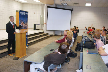 State Treasurer Riley Moore speaks to West Virginia University at Parkersburg and Wood County Technical Center students Tuesday at the Caperton Center for Applied Technology on the campus of WVUP. (Photo by Evan Bevins)