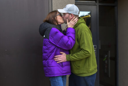Alexandria Johnson, 35, kisses her fiance, Greg Fennell, 42, as he departs for work, Thursday, Nov. 2, 2023, in Oneonta, N.Y. Johnson filed separate lawsuits against New York City and the state corrections department under the Adult Survivors Act, alleging repeated sexual assaults while she was incarcerated at Rikers Island, as well as at the state's Bedford Hills facility that led to the termination of her pregnancy. "I had to take a chance that there would be justice," said Johnson, of her decision to file the law suits. (AP Photo/Heather Ainsworth)