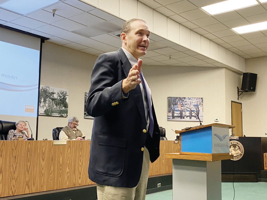 Greg Puckett, a Mercer County Commissioner and member of the national board for the Community Anti-Drug Coalitions of America, spoke Tuesday at Parkersburg City Council chambers as part of the Wood County Prevention Coalition town hall meeting. He talked and shared stories about how drug abuse continues to impact West Virginia. (Photo by Brett Dunlap)