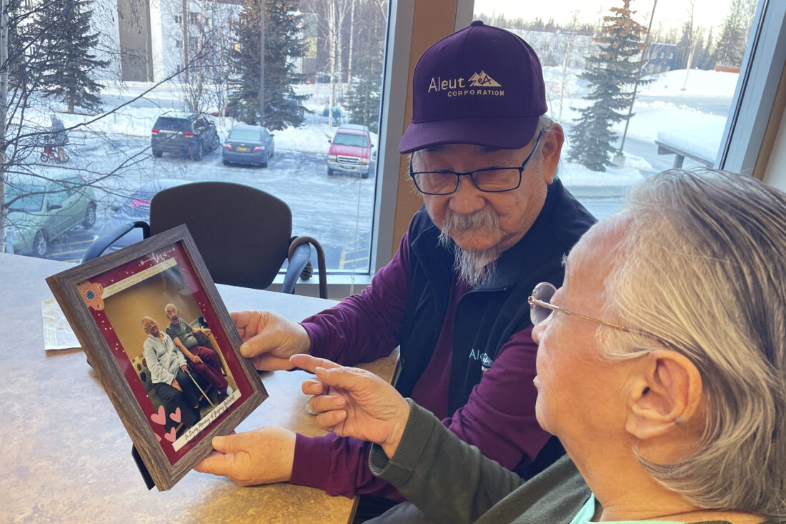 - George Kudrin, left, and Pauline Golodoff hold a photo of Pauline and her late husband, Gregory Golodoff, Friday, Dec. 1, 2023, in Anchorage, Alaska. Gregory and his sister Elizabeth Golodoff Kudrin, George’s late wife, were the last two living residents of Attu, Alaska, whose entire population was captured by the Japanese during World War II and sent to Japan until being liberated after the war. The community of Attu was not rebuilt, and residents were resettled elsewhere, mostly in Atka, Alaska. (AP Photo/Mark Thiessen)