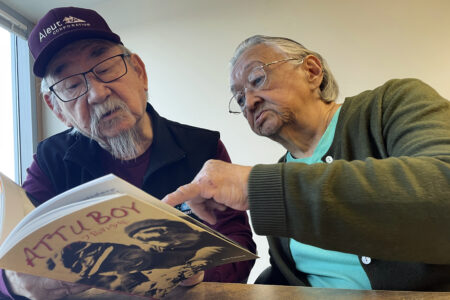 - George Kudrin, left, and Pauline Golodoff look at a copy of the book “Attu Boy,” Friday, Dec. 1, 2023, in Anchorage, Alaska. Gregory Golodoff, Pauline’s late husband, and Elizabeth Golodoff Kudrin, George’s late wife, were the last two living residents of Attu, Alaska, whose entire population was captured by the Japanese during World War II and sent to Japan until being liberated after the war. “Attu Boy” was written by Nick Golodoff, who was Gregory and Elizabeth’s older brother. (AP Photo/Mark Thiessen)