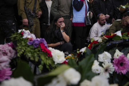 Family and friends of Israeli soldier Major Roei Meldasi mourn over his grave during his funeral in Afula, Israel, Wednesday, Dec. 13, 2023. Meldasi, 23, was killed during a military ground operation in the Gaza Strip. (AP Photo/Ariel Schalit)