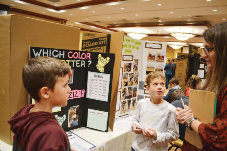 - Emerson Middle School 4th graders Dawson Butcher and Kingston Geer explain to judge Ashlee Beatty, director of curriculum and instruction for Wood County Schools, their science fair project during the Wood County Schools Science Fair held Tuesday at Grand Pointe Conference Center. (Photo by Douglass Huxley)