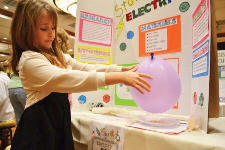 - Beulah Rockhold, a 4th grader from Franklin Elementary, demonstrates the power of static electricity as Rice Krispies cling to a charged balloon for her project at the Wood County Schools Science Fair held Tuesday at Grand Pointe Conference Center. (Photo by Douglass Huxley)