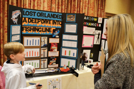 - Carter Allen Lemon, a 4th grader at Mineral Wells Elementary, talks to judge Cherish George, a teacher at Jackson Middle School, about his project to test which fishing line holds up to the stresses of sports fishing. Lemon said monofilament fishing line is the cheapest, and strongest, to use in lake fishing, such as Lake Erie at Cleveland where he said he likes to fish. (Photo by Douglass Huxley)
