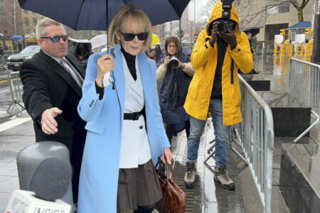 - E. Jean Carroll arrives at Manhattan federal court, Thursday, Jan. 25, 2024, in New York. Former President Donald Trump could return to the New York courtroom Thursday to defend himself against a lawsuit seeking more than $10 million for things he said about Carroll after she accused him of sexual assault. (AP Photo/Ted Shaffrey)