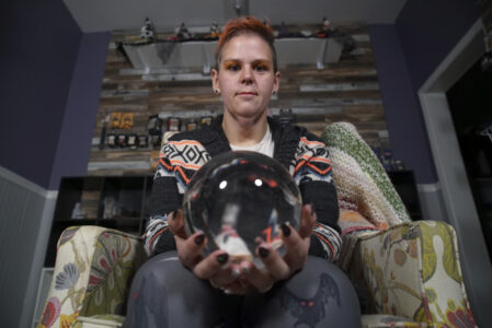 Melissa Sell poses for a portrait with a crystal ball in her shop, Every Witch Way, on the main street of Mount Holly Springs, Pa., on Monday, Oct. 30, 2023. “If it’s a big news story on the TV, the majority of the time it’s to distract us from something else. Every time you turn around there’s another news story with another agenda distracting all of us,” she says. (AP Photo/Allen G. Breed)